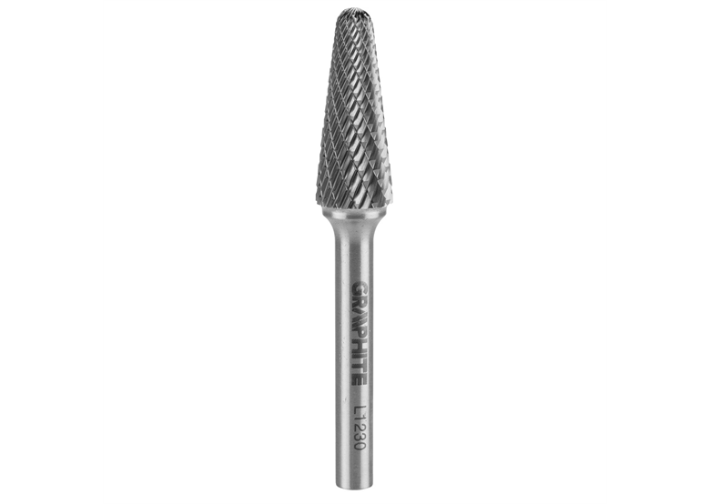 Frez do metalu Graphite 55H377 typu L (stożkowy) i rozmiarze 12 x 30 mm to narzędzie przeznaczone do szlifierki prostej służące do skrawania lub piłowania obrabianej powierzchni. Przeznaczony do prac w materiałach takich jak metal, aluminium i tworzywa sztuczne. Zastosowanie węglika spiekanego sprawia, że narzędzie ma wysoką twardość oraz odporność na zużycie ścierne. Frez ten cechuje się podwójnymi nacięciami, które pozwalają na łatwe usuwanie naddatków w obrabianych materiałach.