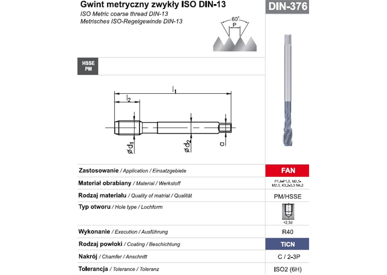 Gwintownik maszynowy wysokowydajny prawoskrętny z gwintem metrycznym zwykłym wykonany zgodnie z normą DIN-376C, R40 FAN TICN jest przeznaczony do otworów nieprzelotowych. Materiał, z jakiego został zrobiony gwintownik - stal szybkotnąca proszkowa - dzięki technologii wykonania PM - charakteryzuje się podwyższoną odpornością termiczną i odpornością na ścieranie. Poddanie obróbce w piecu próżniowym zapewnia wysoką twardość narzędzia przy zachowaniu dobrej ciągliwości. Powłoka TiCN (węgloazotek tytanu) zwiększa twardość powierzchni do ok. 3000 HV. Gwintownik jest idealny do pracy w stali narzędziowej i trudnoobrabialnej o wytrzymałości 800MPa<=Rm<=1200MPa oraz ulepszanej cieplnie do 38 HRC, stali stopowej, stali narzędziowej, stali nierdzewnej ferrytycznej, martenzytycznej, austenitycznej, austenityczno-ferrytycznej (duplex), żeliwie ciągliwym, żeliwie sferoidalnym, stopach aluminium 1%< Si<7%. Dane techniczne: