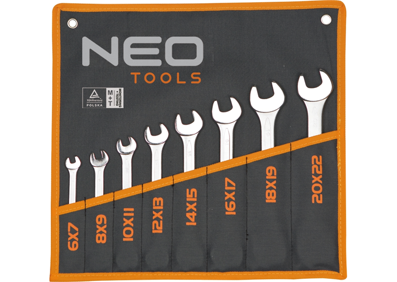 Zestaw kluczy płaskich dwustronnych NEO (nr ref. 09-851) zawiera 8 kluczy w popularnych rozmiarach (od 6 do 22 mm), wykonanych zgodnie z normą DIN 3110. Wysokogatunkowa stal chromowo-wanadowa zapewnia długoletnią wytrzymałość kluczy. Narzędzia dostarczane są w praktycznym etui z nadrukowanymi wymiarami kluczy, co ułatwia ich porządkowanie. Jakość narzędzia potwierdzona certyfikatem TÜV i 25-letnią gwarancją producenta. Marka NEO spełnia oczekiwania profesjonalistów.