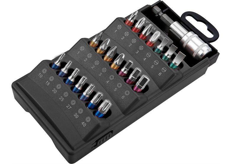Końcówki wkrętakowe GRAPHITE (nr ref. 57H996), komplet 22 sztuki, zawiera zestaw bitów 1/4"x25mm w najpopularniejszych rozmiarach i typach. Specjalna konstrukcja pudełka do przechowywania pozwala na zamocowanie go jako magazynka bitów na pasku monterskim. System wysuwania i chowania bitów jedną ręką znacząco ułatwia dostęp do końcówek i ich łatwą wymianę. Kolorowe owijki na poszczególnych typach bitów pozwalają na łatwą identyfikację potrzebnej końcówki.